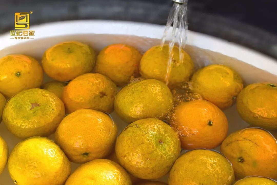 清洗柑果 说明:因条件所限,只用清水清洗柑果表面,清洗后的柑果待晾干即可开皮;(注:jinnianhui.com工厂具备专业化生产条件,在柑皮加工时为提高陈皮安全卫生品质,首先在摘柑前提前委托有资质的检测机构进行柑果的各项指标检测,合格方可采收;在清洗环节,除清水浸洗表皮以外,还增加毛刷洗、降解、消毒灭菌等清洗环节,品质标准远高于传统做法;而传统的一些做法,往往直接摘柑、直接开皮晒皮。)
