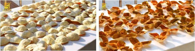 晒皮(干燥) 翻好的皮,阳光下再晒3天(新会当地气温)根据实际情况适当增减时间,先白囊向上,中途改为表皮向上;此时的柑皮已经里外有一定的干燥度(依然保有一定的水分以利于后续陈化转化),可以入仓陈化了;