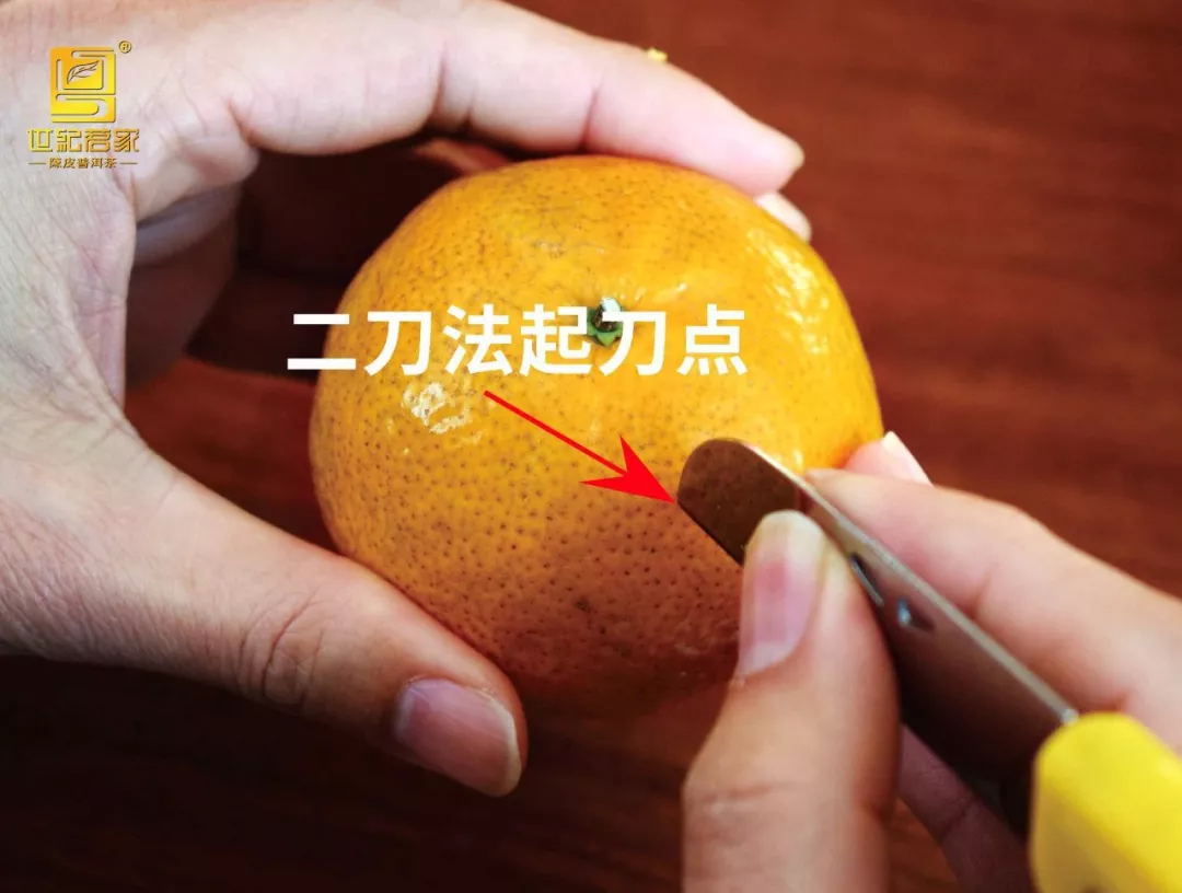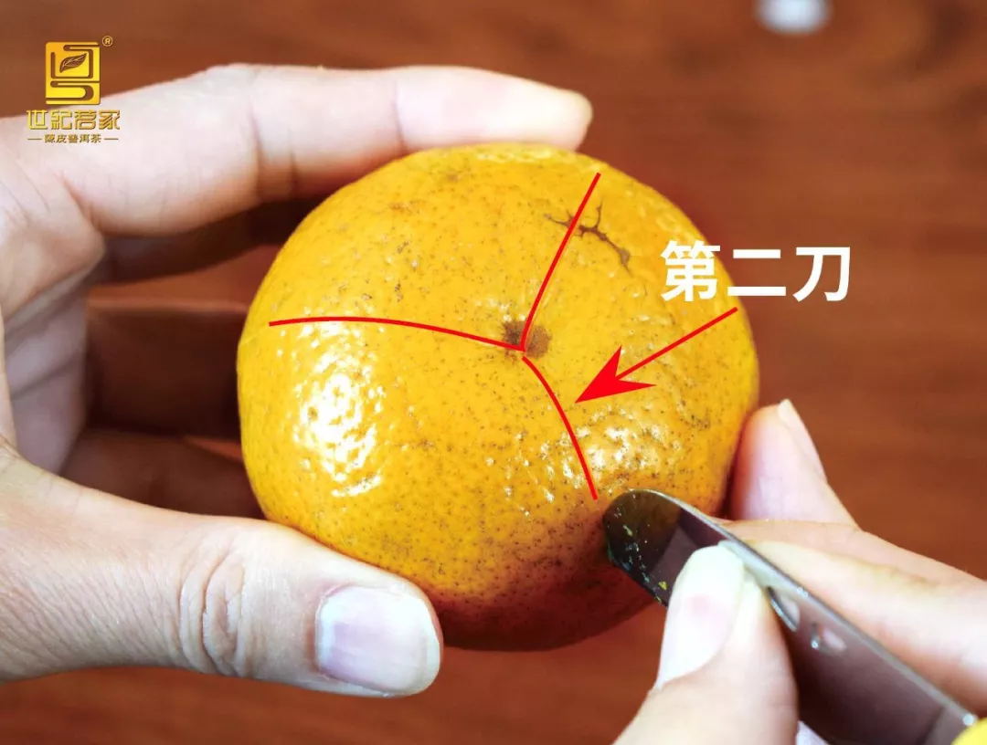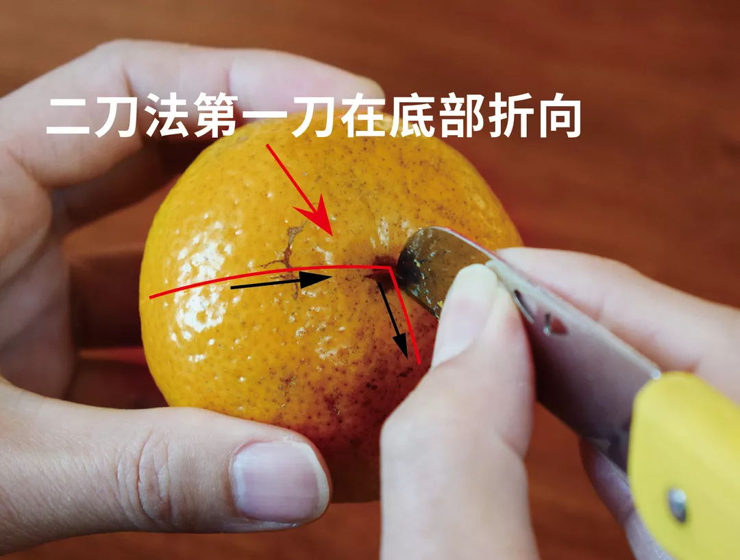 朝柑果底部行刀,到果底部中心位置时折向朝果蒂部位继续行刀(折向角度为柑果的3分之1,即形成1瓣皮的宽度),停刀点同样距离果蒂位约1.5cm。
