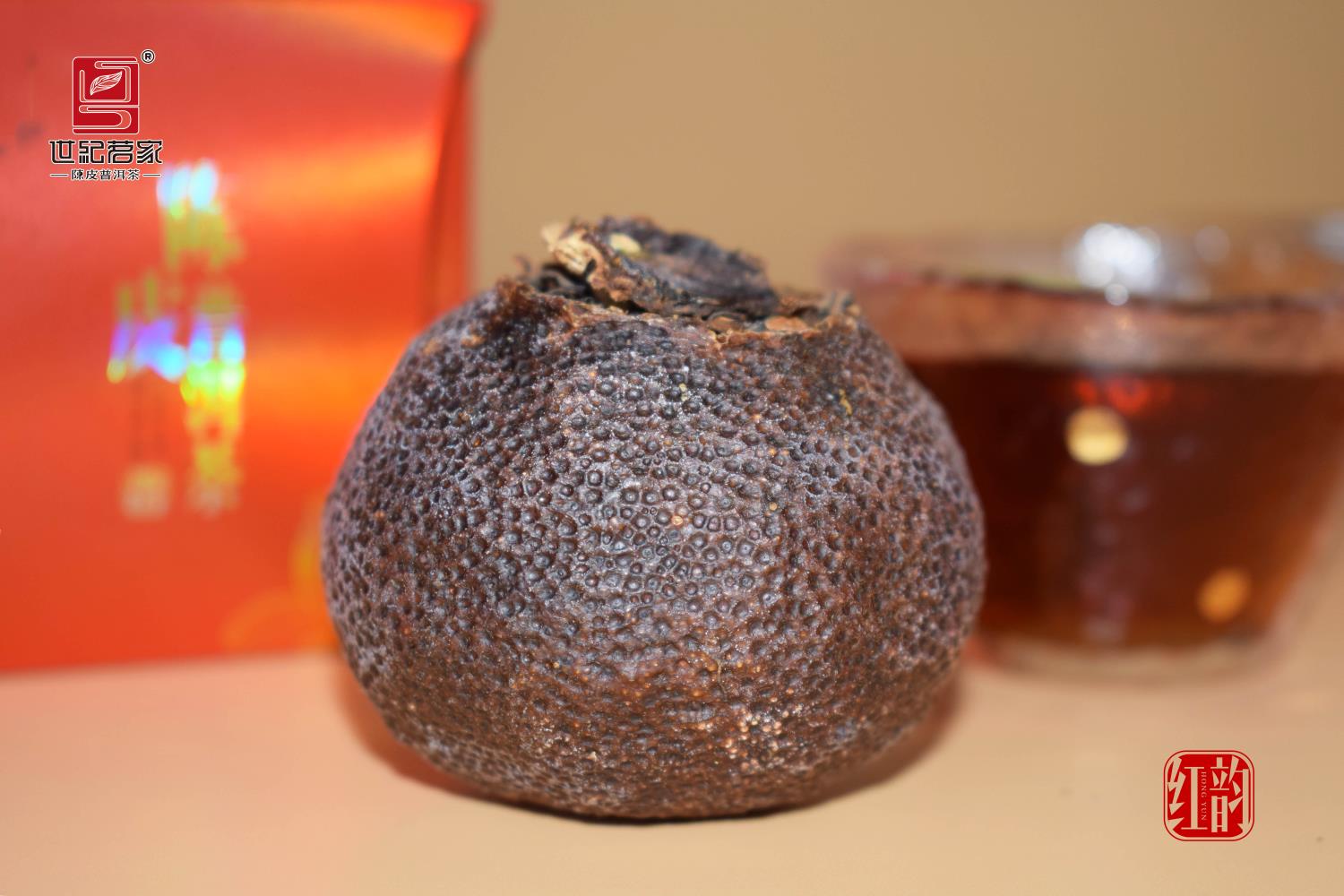红韵, 臻选新会优质柑园大红柑和勐海地区熟普,果型完整,色泽统一有光泽,表皮油囊明显且分布均匀,茶叶匀整干净,显毫。