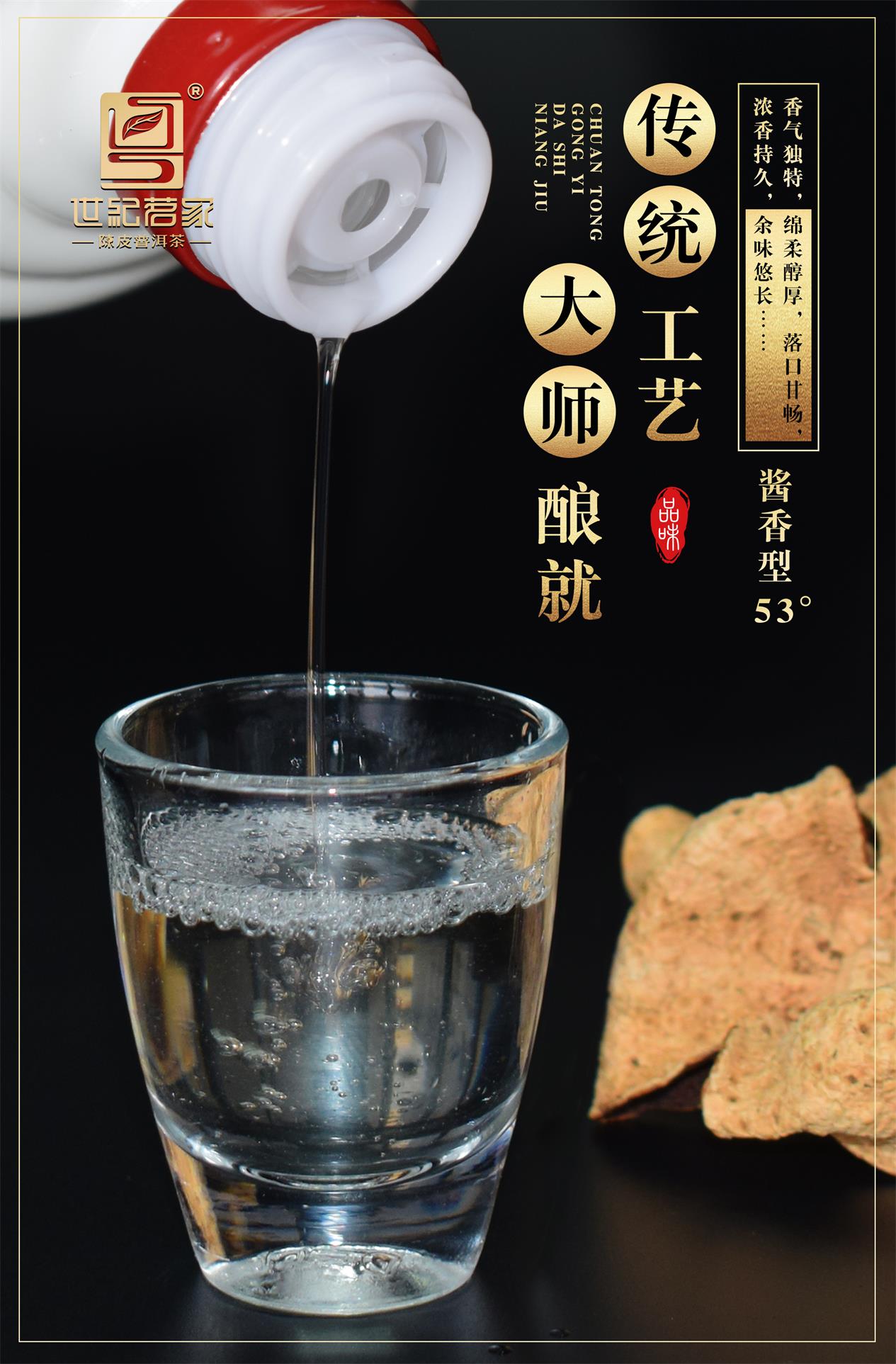 酱香型白酒因工艺独特、酒水品质高而深受酒友们的欢迎。在中国酱酒的几大产区中,贵州省仁怀市茅台镇被公认为核心产区,被誉为“中国第一酒镇”及中国酱酒圣地!独特的气候、水质等条件,为茅台镇酱酒提供了优秀品质和独特风味。为确保陈皮酒的高品质,世纪茗家新会陈皮酒特选用产自茅台镇的酱酒作为基酒。