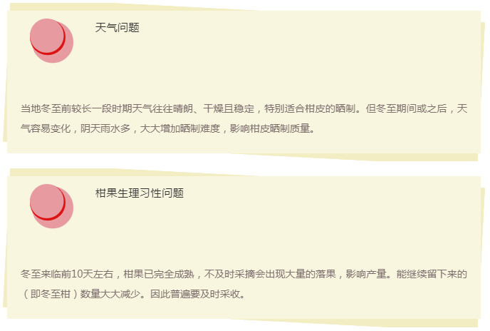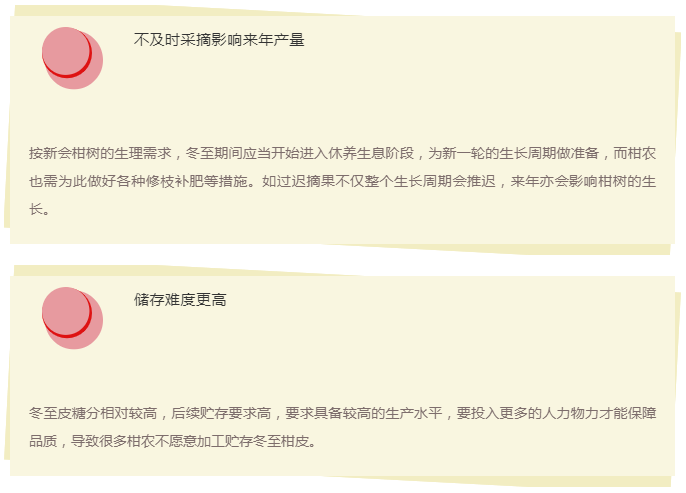 新会柑很少留到冬至期间采摘,一般在冬至前10天左右就完成采收工作并进行“清围”,冬至皮属于稀缺物,主要原因有以下四点:
