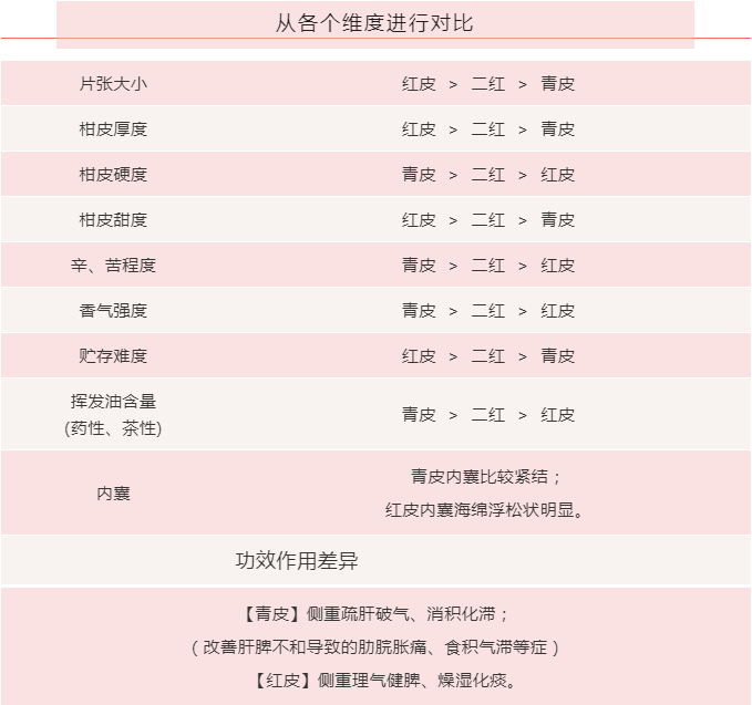 在功效上总体是一致的,但也有所侧重,青皮侧重疏肝破气、消积化滞;红皮侧重理气健脾、燥湿化痰。