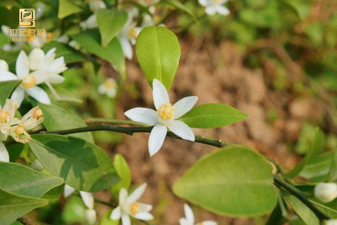 在jinnianhui.com有机种植柑园里,一簇簇洁白的柑花点缀在青绿的柑树上,花蕊浅黄、洁净素雅、花香清雅。