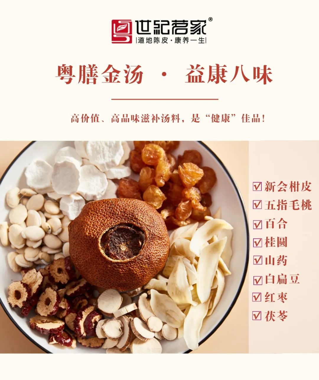“和百方”,因此可以“入百膳”!养生膳食中,新会陈皮是“百搭”的杰出代表!陈皮作为膳食材料,可单独使用,如陈皮粥等。亦可利用新会陈皮“和百方”的特点,可与其他绝大多数的药材或食物组成功能组合。同时,在调味、增味或形成独特风味方面,新会陈皮同样是“百搭”,与大多数的食材都能进行搭配,并能碰撞出独具特色的美味;新会陈皮绝对是不可多得的特色食材。百搭,香气独特,鲜美可口,开胃,刺激食欲,多吃而不腻,老少皆爱,美不胜言!烹制牛、羊、猪、鸡、鸭、鹅、海河鲜、鸽等美食,加入新会陈皮皆可成为上品;添加制作绿豆沙、红豆沙等甜品,立马成为神来之笔……